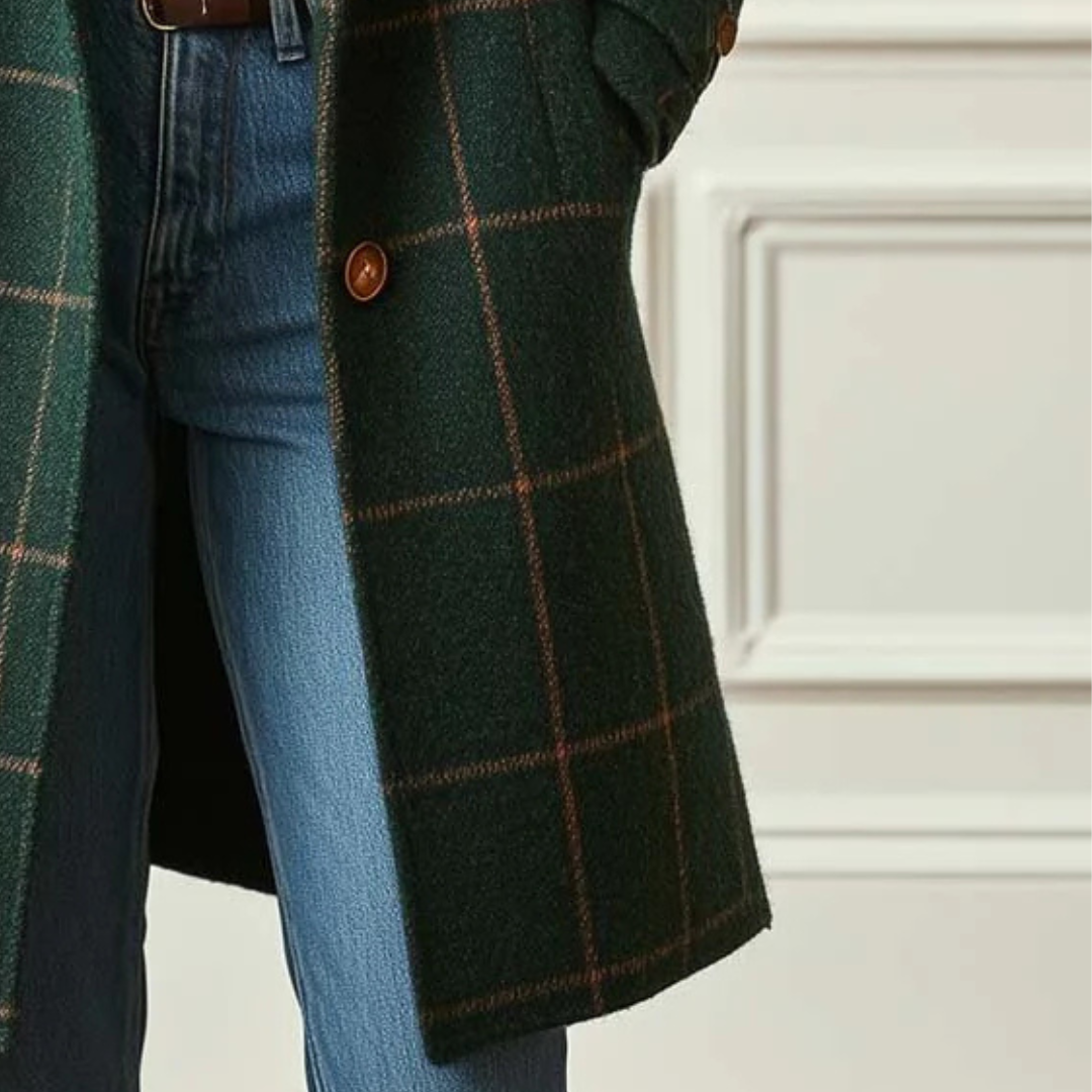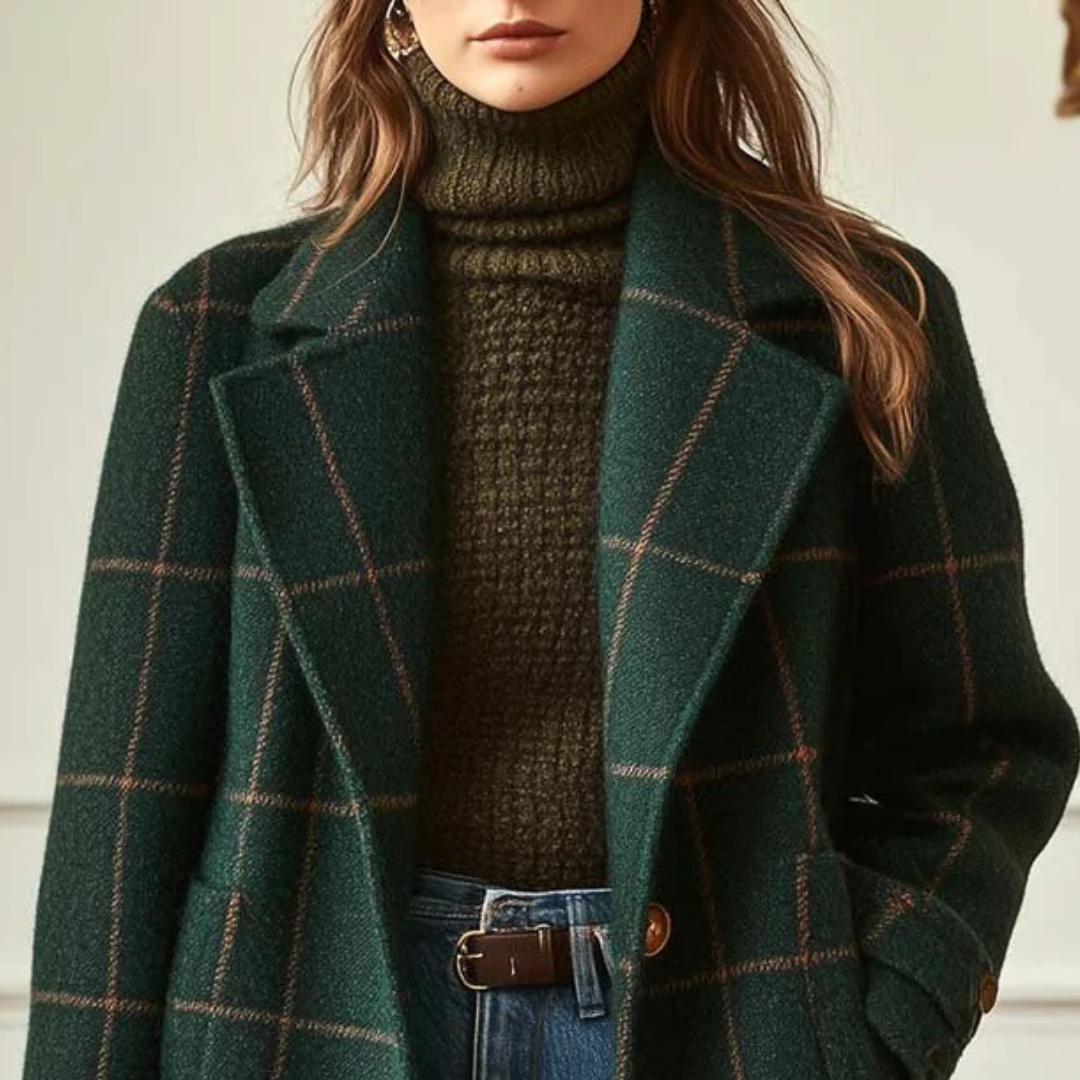 Il suo tessuto di qualità offre un calore piacevole e una vestibilità curata, mentre il taglio aderente valorizza naturalmente la silhouette, senza rigidità. Il motivo a quadri raffinato e il colletto con revers apportano un tocco di sofisticazione calma — quella sensazione di essere perfettamente vestite, senza esagerare.